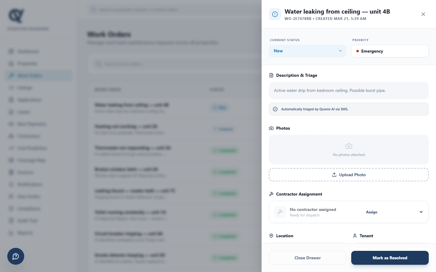 Quovio's dispatch is managed, not auctioned. You build your vendor network. The system handles the scheduling, communication, and proof-of-work collection. Contractors get confirmed, scheduled jobs — not a race to underbid. Your success metric is time-to-resolution, not time-to-bid.